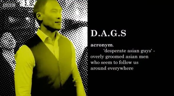 “D.A.G.S – desperate asian guys” “压抑的亚裔处男只会跟在我们屁股后面转。”