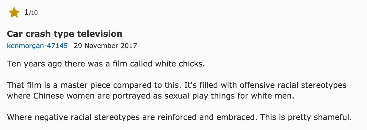 “这部剧简直是车祸现场“,充满了冒犯性和种族歧视的片段,中国的女性被物化为轻浮的、白人的玩偶,真恶心。