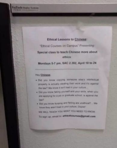 近年来,国外高校涉及辱华的事件时有发生,每次都引起公众的大范围讨论。身在OSU的我也亲历了一次这样的事情,当时,学校教室里出现了辱骂华人的字条,粗鲁的语言不堪入目,着实让人大吃一惊。