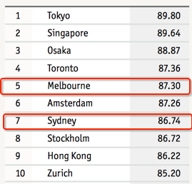 经济学人智库(The EIU)在上月底发布了《2017年全球城市安全指数(Safe Cities Index 2017)》报告。日本东京以89.8的最高分位居安全城市排行榜的第一,新加坡和大板紧随其后。澳大利亚的悉尼和墨尔本也成绩亮眼,双双入围前十,墨尔本以87.3分排名第五,悉尼以微弱差距的86.74分位居第七。中国香港也表现不俗,排名第九。