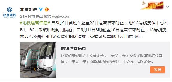 地铁运营信息自5月9日首班车起至22日运营结束时止,地铁8号线奥体中心站B1、B2口采取临时封闭措施。自5月11日8时起至15日运营结束时止,15号线奥林匹克公园站H口采取临时封闭措施。乘客可从其他出入口进出站。