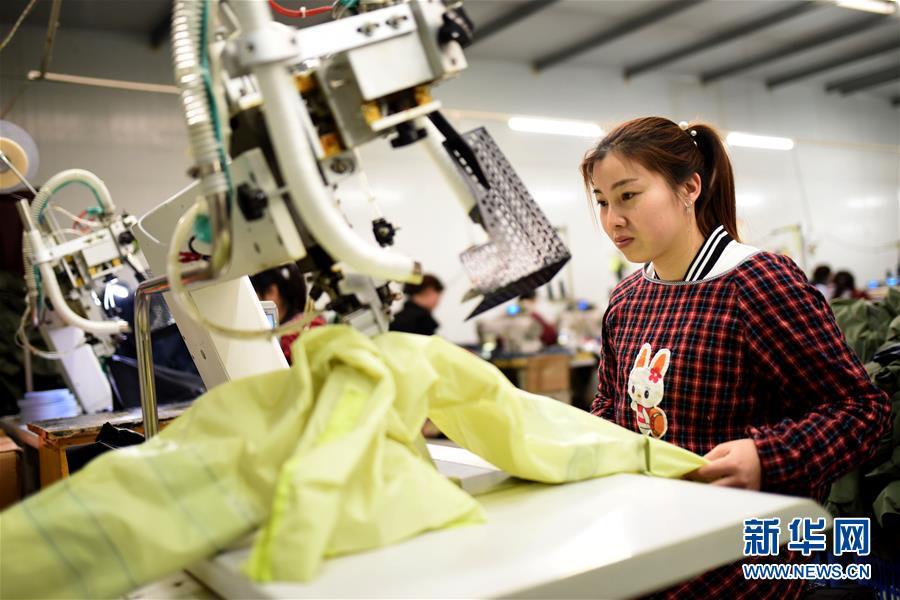 5月2日,河北南和县三思乡后郭平村村民在当地一“扶贫车间”内加工雨衣。 新华社记者 朱旭东 摄