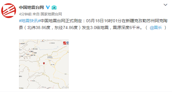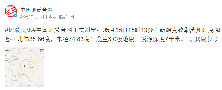 #地震快讯#中国地震台网正式测定:05月18日16时01分在新疆克孜勒苏州阿克陶县(北纬38.86度,东经74.86度)发生3.0级地震,震源深度6千米。