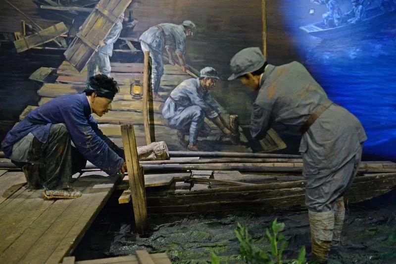 于都县中央红军长征出发纪念馆中苏区群众铺设浮桥场景。新华社记者 万象 摄