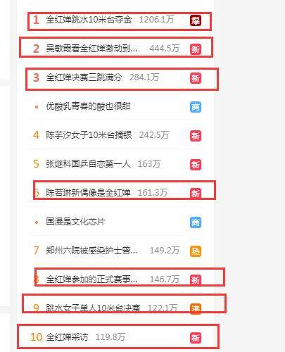 关于全红婵的词条在社媒引发热议,一度前十位有7个与全红婵有关。这一天的全红婵彻底火了。