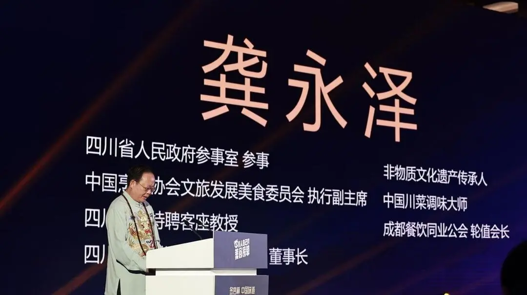冠名单位——四川金宫川派味业有限公司董事长龚永泽在发言中强调,推广川派美食兼具商业使命与社会责任。他表达了金宫川派味业与绵阳本地优质餐企开展深度合作的强烈意愿,着眼于资源整合、优势互补,共同推动绵阳餐饮的连锁化、品牌化发展。龚永泽董事长庄重承诺,金宫将在“品牌联名、资本合作、搭建完善供应链体系、技术标准化和市场拓展”等方面提供全方位支持,赋能产业发展。盛典现场,龚永泽董事长荣获主办方颁发的“川派特色美食榜(绵阳站)特别贡献奖”,以表彰其在川菜文化传承创新及本次活动支持上的突出贡献。