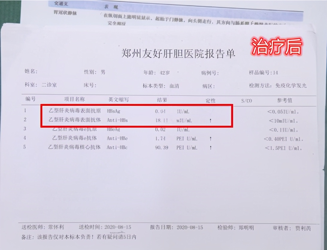 和其他患者一样,出院后,常主任及其团队继续对陈先生进行定期随访,交代注意事项和用药情况。一个月前,陈先生再次来院复查时发现,除了生化指标正常外,患者的血清学指标也达到了转换,乙肝五项有“145+”转为了“245+”,甩掉了“乙肝”的帽子。陈先生带着这份欣喜远赴外地打工,也找到了自己心仪的工作。这次为表示对郑州友好肝胆医院的医护人员的感谢,特意定做了锦旗快递了过来。