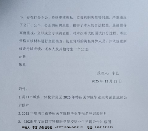 【来信刊登】周口市城乡一体化示范区2025年特招医学院毕业生考试有猫腻!